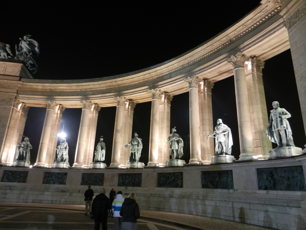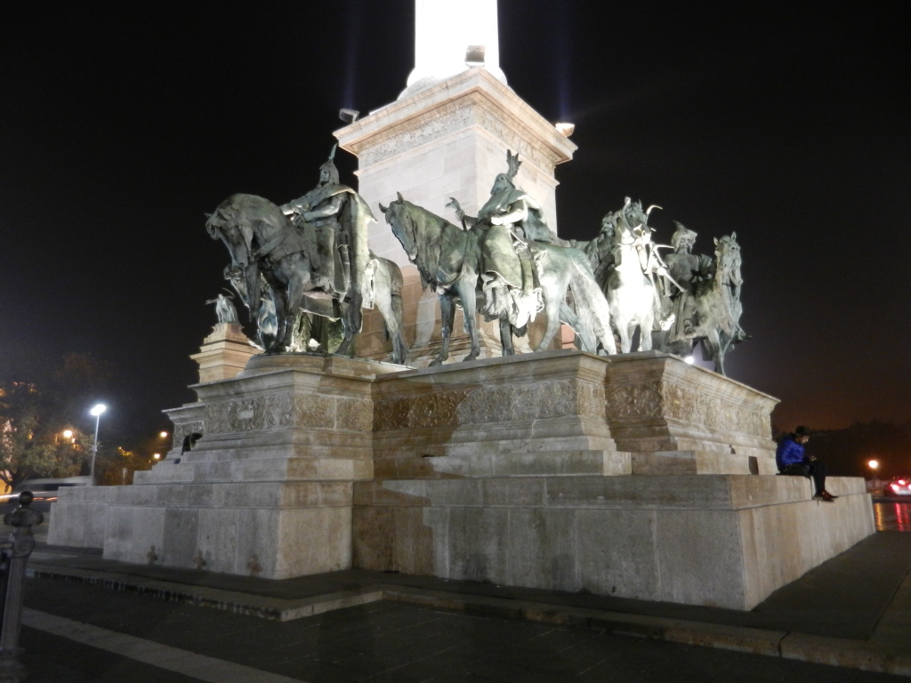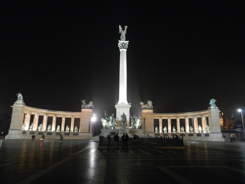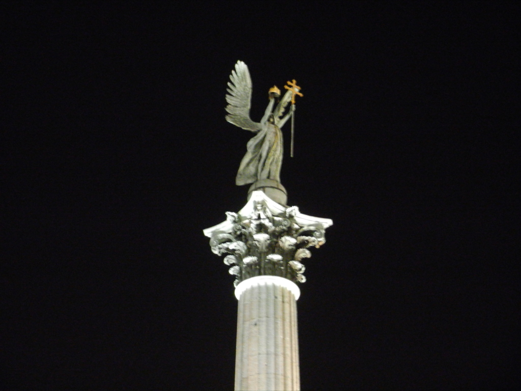 Dipping and dodging through traffic, we hurtled at top speed towards Heroes Square upon our clanky, green bicycles, stopping for nobody. Luckily, Heroes Square was rather spacious and I had plenty of room to zip around the statues of Kings and ancient leaders, striking various princely poses upon their pedestals. In the centre of Heroes Square stands the Millennium Monument, a pillar supporting the archangel Gabriel and crowded at its base by Seven mighty chieftains, leaders of the seven Hungarian tribes that first came to the region in 895 AD.