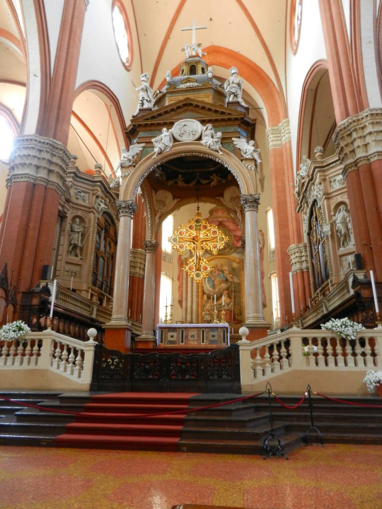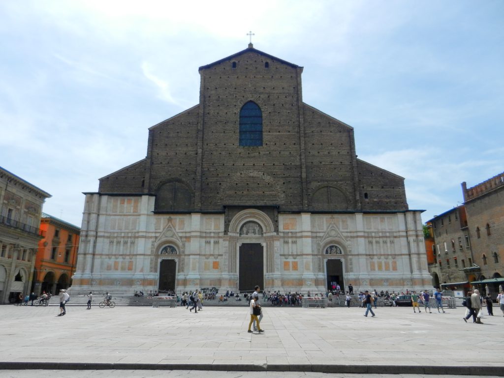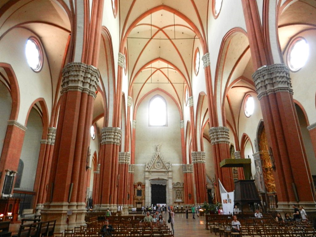 While wandering Bologna, you will eventually end up in the main Piazza Maggiore, just as we did. This beautiful plaza is flanked by marvellous buildings, including the colossal Basilica di San Petronio. Dominating Piazza Maggiore, the Basilica holds 22 chapels and is the 10th largest church in the world (by volume). The marble facade, started in 1538, was never completed and only creeps up halfway, revealing the Basilica’s brick construction. Despite its shortcomings, the multi-coloured marbles and sculptures are impressive. The interior of San Petronio’s Basilica is simple yet elegant, with red pillars stretching into the vaulted ceiling like a tree canopy. We noticed, embedded in the exquisite, mosaic floor was a meridian line, designed by an astronomer from the university in order to determine the length of each solar year.