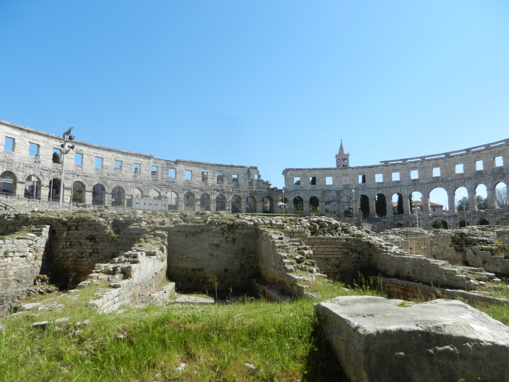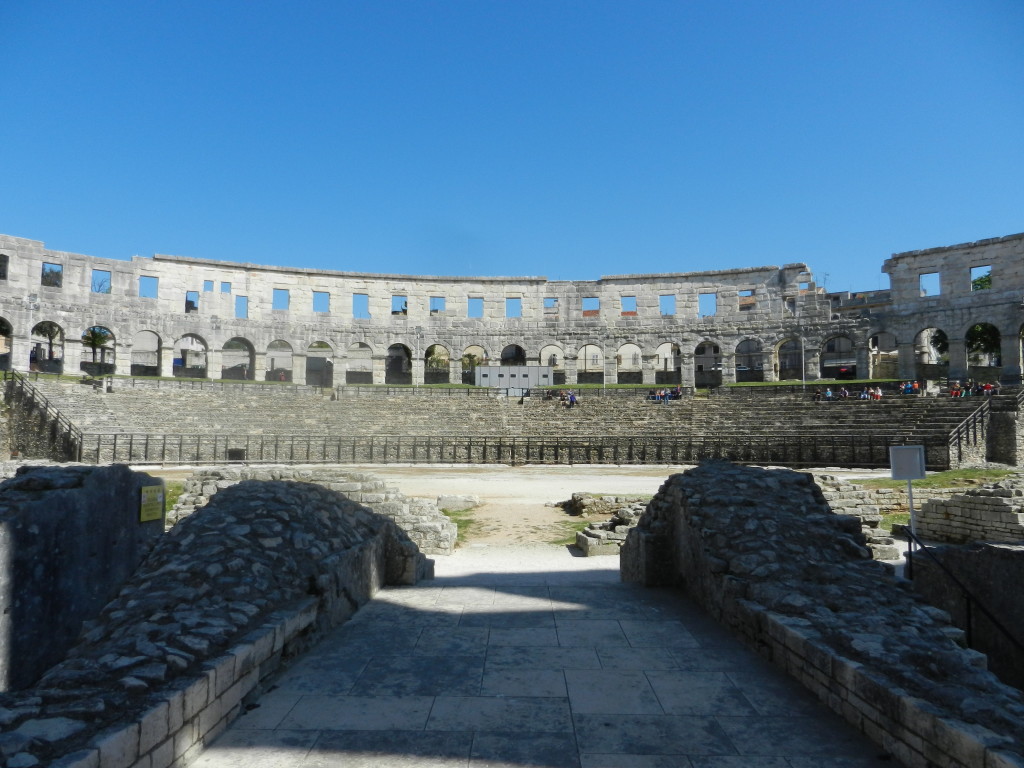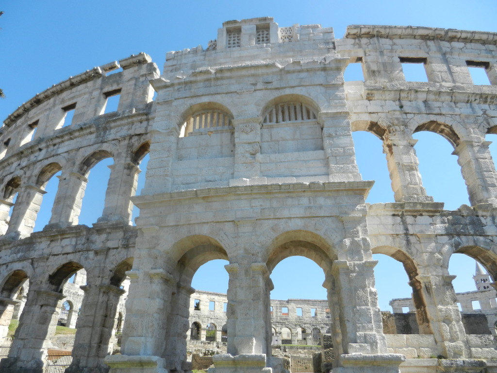 Pula’s Ampitheatre was hard to miss and the first thing we saw. Built in the 1st century it is one of the 6 largest Roman arenas left in the world and is very well preserved. The Arena once had 15 gates, underground passageways from which they could release wild animals, giant sails to provide cover over the spectators, and gladiators locked in bloody, mortal combat (I just love saying that). After the gladiator fights were outlawed in the 5th century, the amphitheatre fell into shambles until 1932 when it was renovated for military parades, public meetings, and theatre productions. These days, during the summer, all kinds of festivals take place inside the arena which can seat up to 5000 spectators.