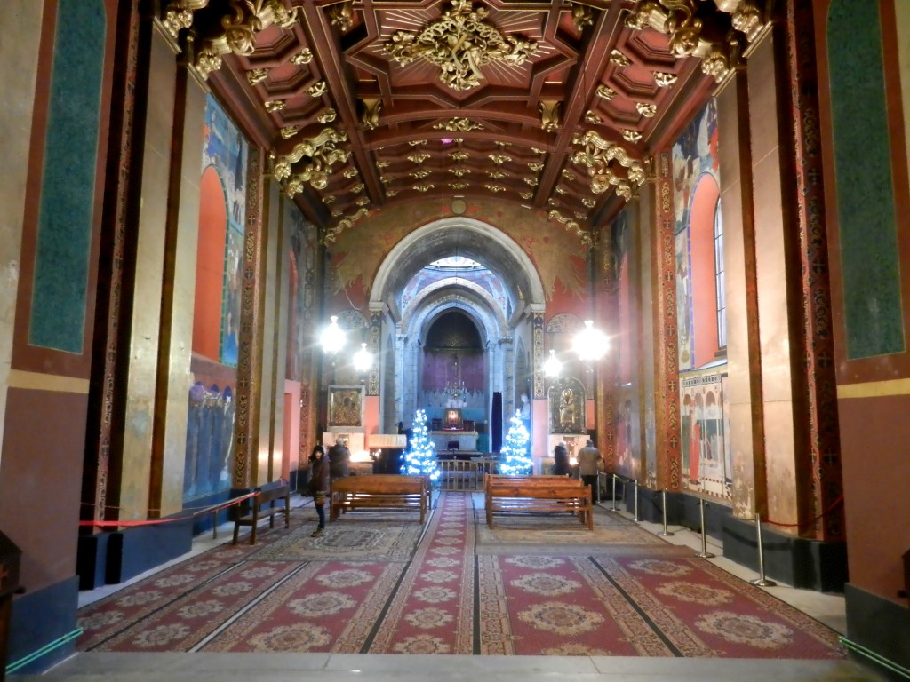 First entering the cathedral you’re hit by a shock of colour, but in a slightly more subdued sense than the blast you’re hit with when you walk into a Ukrainian Orthodox cathedral. The designs are distinctly Eastern (obviously, it’s Armenian after all) and the patterns have a similar, mesmerizing quality we found in many of the mosques we visited in Turkey. Khachkars, Armenian cross-stones, date close to when the cathedral was constructed in the 14th century, while other, more modern paintings and mosaics are from the 20th. The paintings… Well, they were a bit spooky to be honest. There’s one depicting John the Baptist’s head on a platter, while another eerily layers ethereal outlines over a funeral procession.