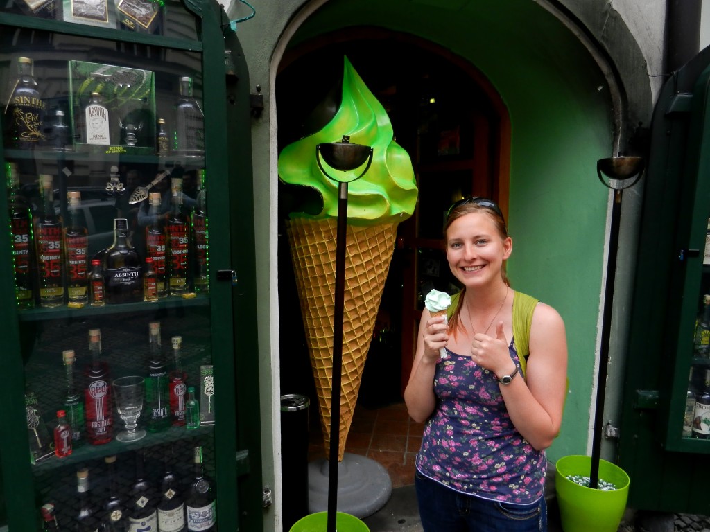 Ahh, Absinthe. Yet another first impression I got from watching “Eurotrip“. Actually originating in Switzerland, this potent, traditionally anise-flavoured liquor probably isn’t for everybody, but especially in Prague they do their very best to appeal to every taste. You can find flavoured versions, different colours, absinthe in novelty bottles (think skulls, marijuana leaves, etc.), and even absinthe flavoured ice cream.The Bohemian-style “absinth” sets itself apart from the traditionally prepared absinthe produced in other countries by its lack of anise, fennel, and other herbal flavours, and instead is described as more of a “wormwood bitters”. Absinthe is derived from a variety of botanicals, but the one that bestows its infamy are the flowers and leaves of Artemisia absinthium“Grande wormwood”. Absinthe was at one time portrayed as an addictive substance and a hallucinogen, people blaming small amounts of thujone for its negative effects. Consequently, but the beginning of the First World War absinthe had been banned in the United States and much of Europe. Recent studies, of course, proved that the psychoactive properties of absinthe were exaggerated, it was no more dangerous than other strong spirits, and absinthe is once again in most liquor stores in North America and Europe.