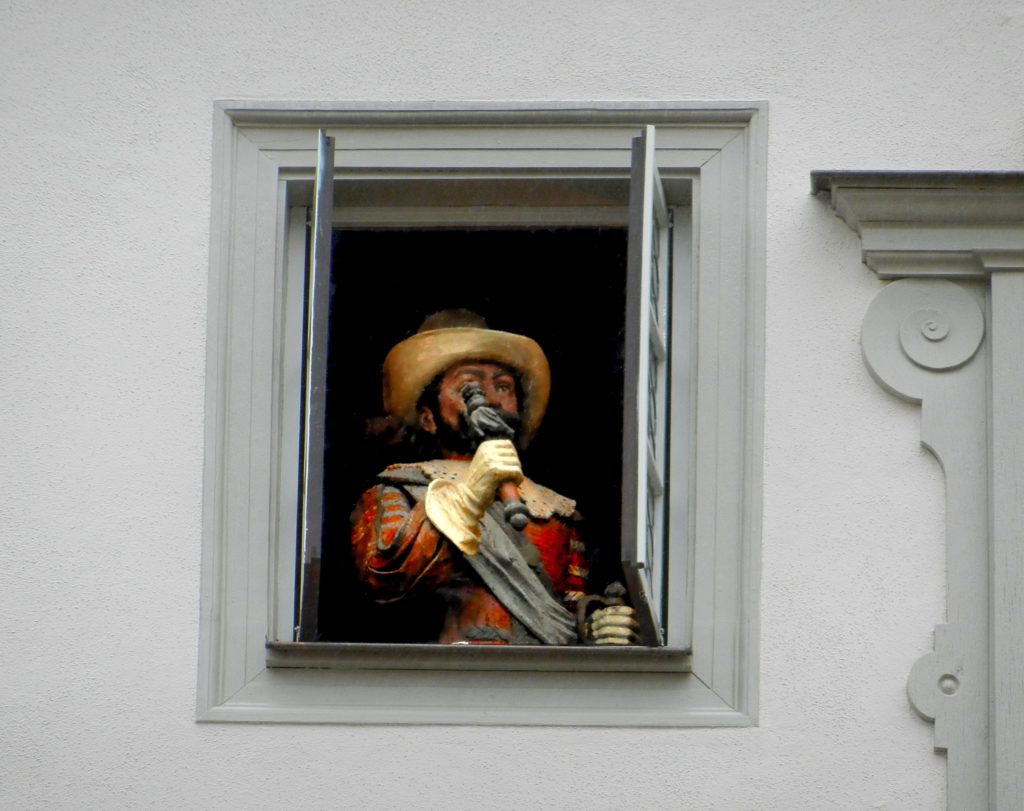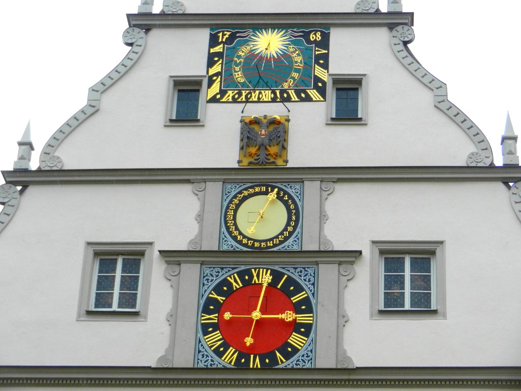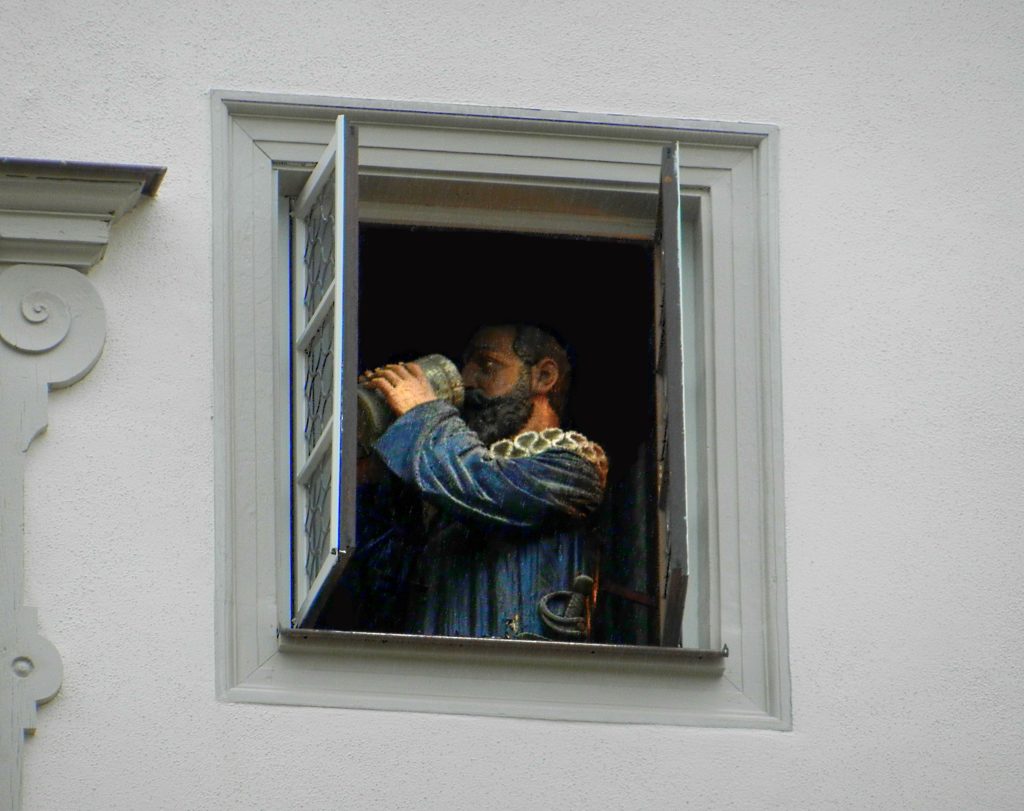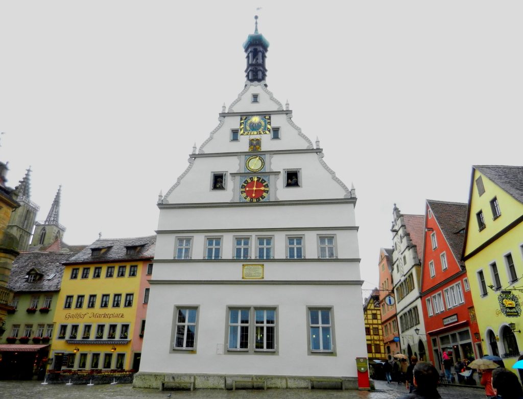 It seemed everywhere we looked there was another clock tower, but the most intricate of them all was in Market Square. What looks like three different clocks decorate the facade of what was once the Councillors’ Tavern. One clock shows the day of the month, another the hour, and the last shows the minute. Mechanical wooden figures pop out of the building throughout the day, forever re-enacting the legend of Mayor Nusch. It is said that during the Thirty Years War, Imperial Marshal Tilly besieged and successfully captured Rothenburg ob der Tauber. His plan was to burn it to the ground and execute the towns officials, but upon hearing the pleas for mercy, Tilly instead put forth an impossible test. He challenged any of Rothenburg’s administrators to empty a gallon of wine in one gulp. Mayor Nusch was up to the task, guzzling the wine and forcing Tilly, upon his honour, to spare Rothenburg from destruction and death. The four-day festival of Meistertrunk, the Master Draught, is celebrated every May to commemorate Mayor Nusch’s bravery.