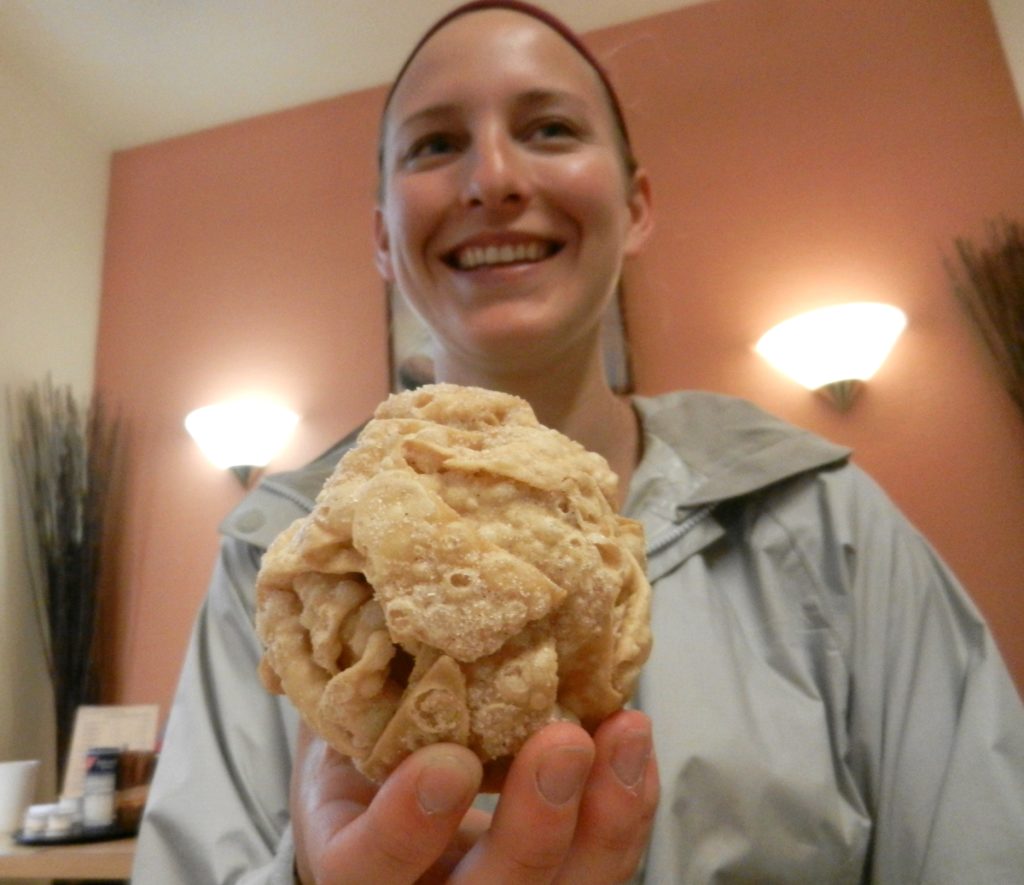 Market Square is also bordered by the grand Rathaus (Town hall), St. George’s fountain, touristy shops, cafes and bakeries. It’s hard not to notice Rothenburg’s somewhat famous Schneeball (“snowball”) pastry, displayed in every bakery window. All different colours, shapes and sizes, you cannot resist a tasty Schneeball. Delicious fried dough rolled up and sprinkled with icing sugar, this has been a favourite Bavarian treat for 300 years. But how does one eat it?