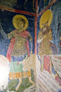 Saint Nicholas (left), the miracle maker, depicted at the Boyana Church Unesco World Heritage Site. The different layers of paint – and different dress – are clearly visible in this photograph.