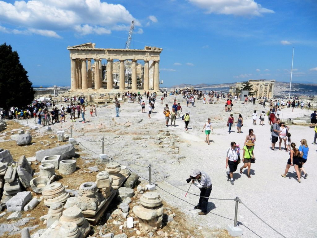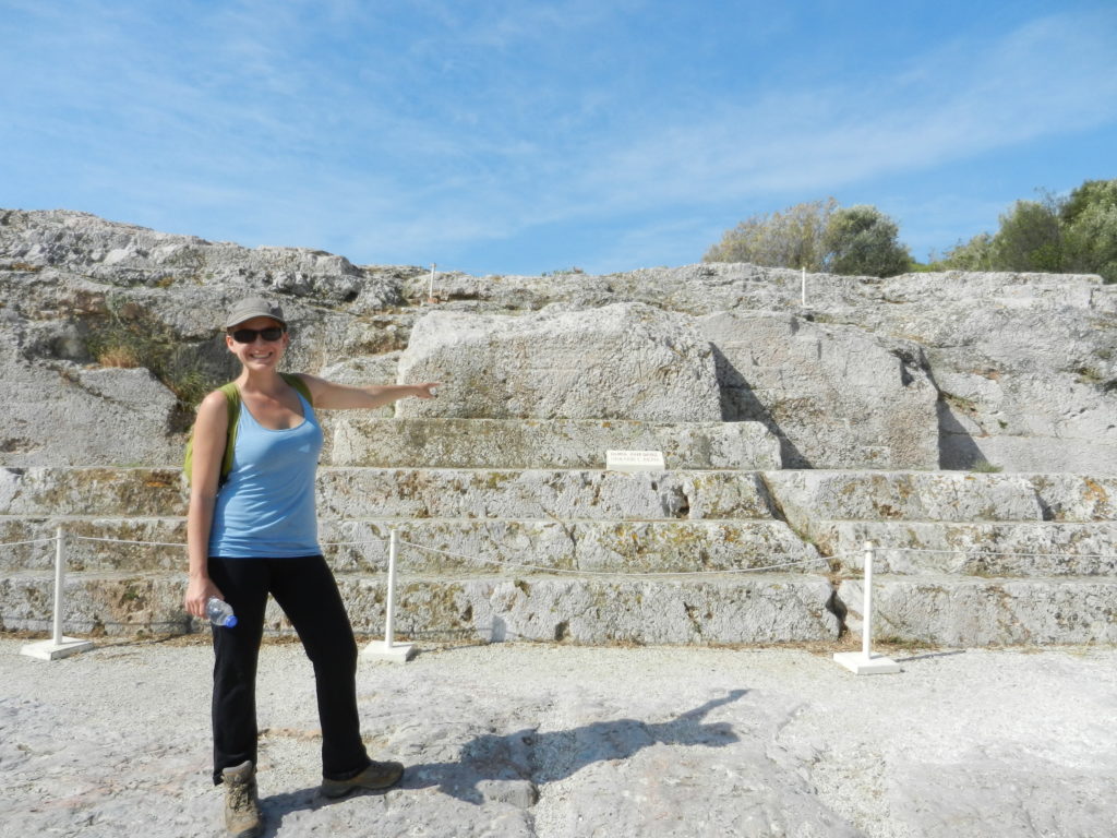 We were briefly side-tracked by the ruins of the Pnyx on our walk to the Acropolis. The Pnyx was the birthplace of democracy, a meeting place for Athenians from the 5th century BC. In theory, all citizens had the right to speak at the Pnyx’s democratic assemblies (except for women, of course). If you said anything stupid, you could be subjected to punishment, so in practice most common folk left the decision-making to the professionals. A council of 500 were selected by lottery to serve a year, guiding the assembly and preforming administrative duties. Every nine days up to 13000 citizens would gather at the Pnyx to take part in Athen’s democratic government.