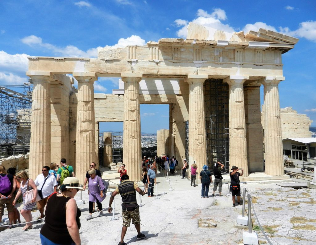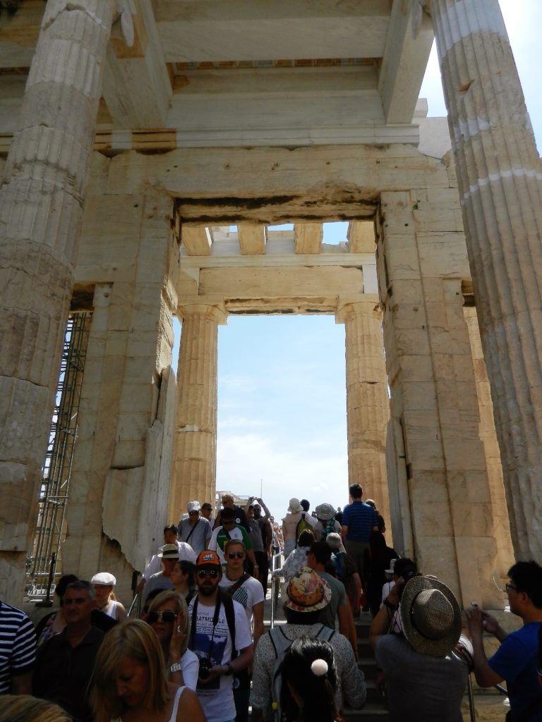 After climbing the stone staircase we passed through the Propylaia, the main gateway into the Acropolis. The ruins of its past splendor are still impressive to behold. The mighty, six columned facade of the Propylaia gives you a preview of the grandeur within its gates.