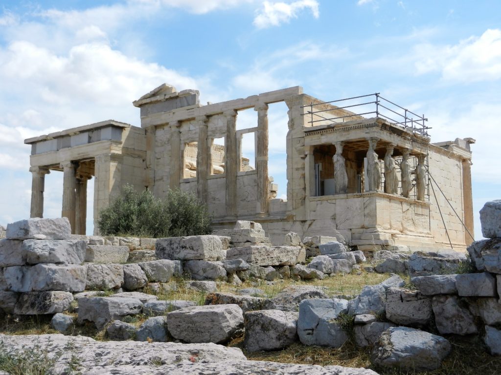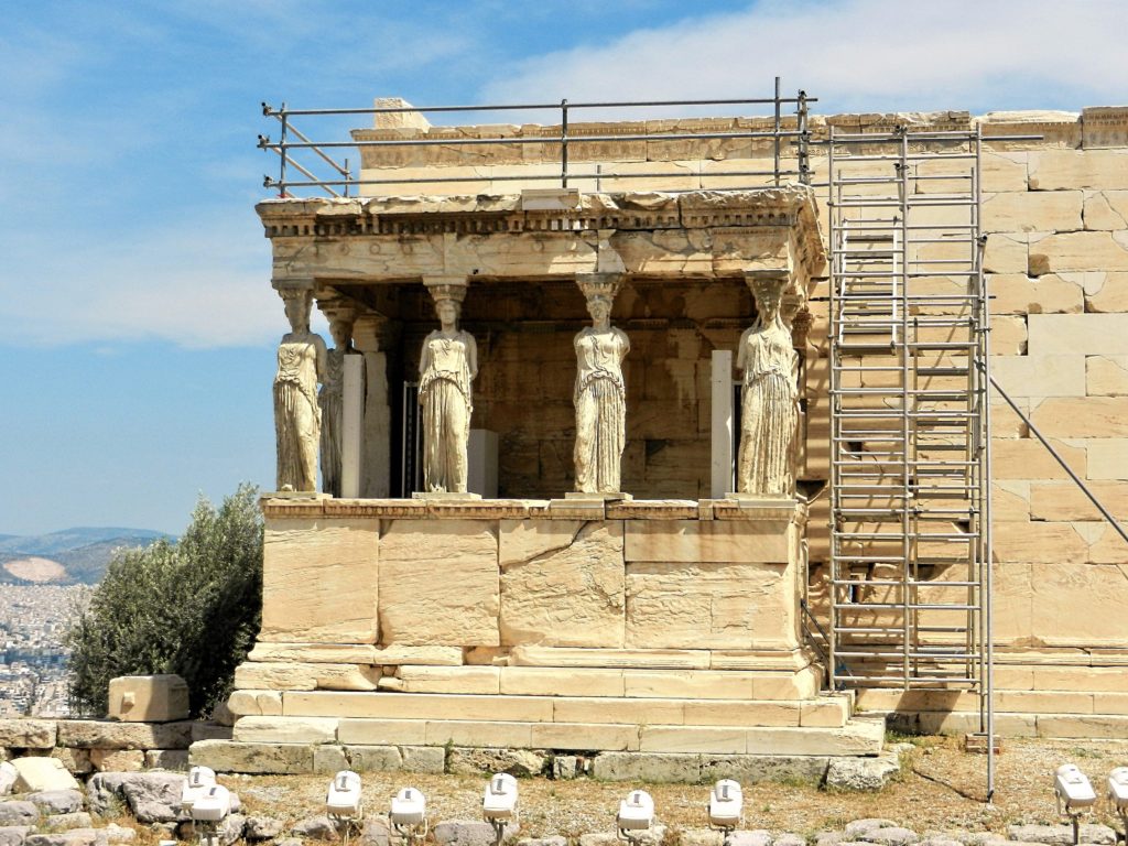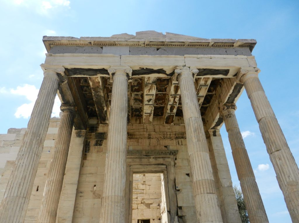 On the north side of the Acropolis is the Erechtheion, supposedly built on the site where Athena and Poseidon held their contest to be patron of Athens. While the Parthenon was more so a tribute to Athena than a place of worship, the Erechtheion was the temple one would go to for prayer. One notable feature is The Porch of the Caryatids, six stone maidens as supporting columns. These are replicas, the real Caryatids are kept inside the Acropolis Museum and one in the British Museum in London. Several sculptures from the Acropolis were sold to a British Lord Elgin during Ottoman occupation, and eventually sold to the British Museum. The Greek government is still trying to get these priceless statues back to where they belong.