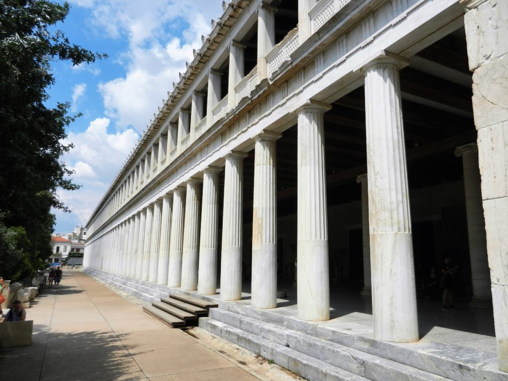 Although much of the Ancient Agora is in ruins, two spectacular structures stand out. The Stoa of Atallos and the Temple of Hephaestus. The Stoa of Atallos you see today is actually a 20th century recreation of the original which was destroyed in 267 AD. This marble edifice was 115 metres long, had two floors and 42 rooms. Each room had its own shop and artisan. Athenians would come to the stoa to hide from harsh weather, hangout and socialize.