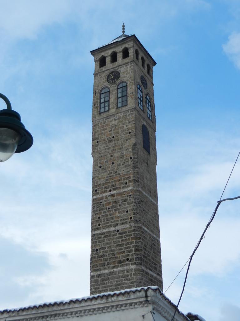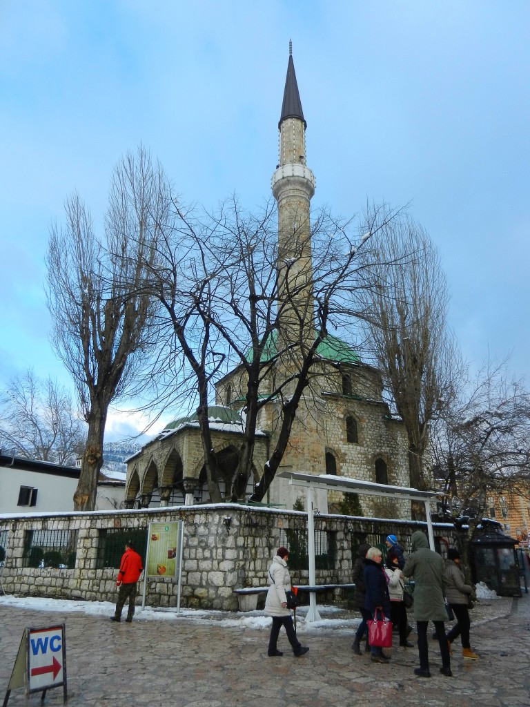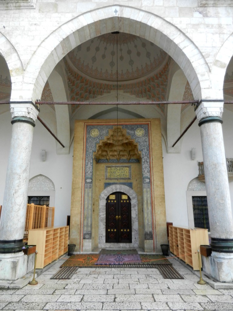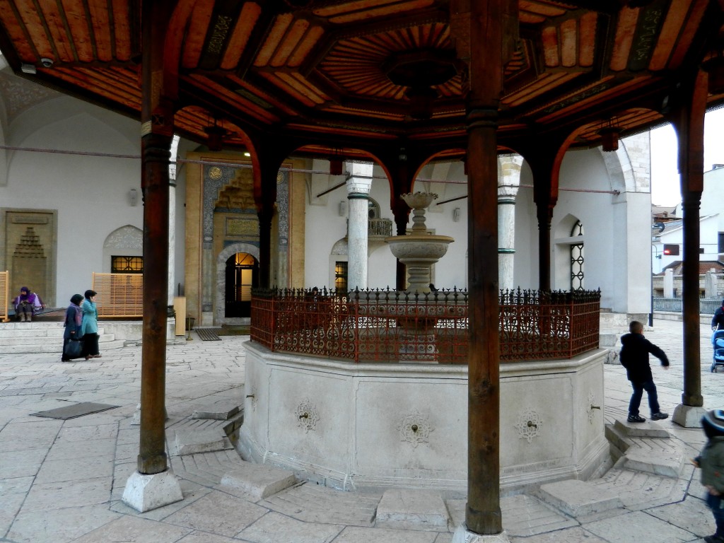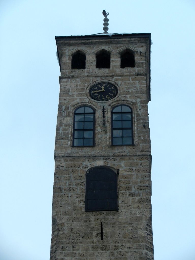 Our next stop was Gazi Husref-bey’s Mosque, a beautiful place of worship, built in 1530. You can find the name Gazi Husref-bey all over the city as he made huge contributions to urban development in downtown Sarajevo. In addition to his mosque, Gazi also ordered the construction of numerous other mosques, the covered bazaar (Gazi Husrefbegov bezistan), the city’s first Islamic school, public baths, the old clock tower (sahat kula), and much more. With his influence, Sarajevo became one of the most advanced cities in Europe at the time. Directing our gaze upward, our guide pointed out the curious face of the “clock” on the old clock tower, and asked us what time it was. Bewildered, we replied we weren’t sure as it was written in what we presumed to be sanskrit and the hands weren’t in the places we would have expected at that time of day. In fact, the clock keeps lunar time to indicate the the times to pray, rather than the time of day as we interpret it. Since the time of sunset changes throughout the year, traditionally a timekeeper was charged with maintaining the clock’s accuracy, a position that would be passed down through the family line. Neat, eh?