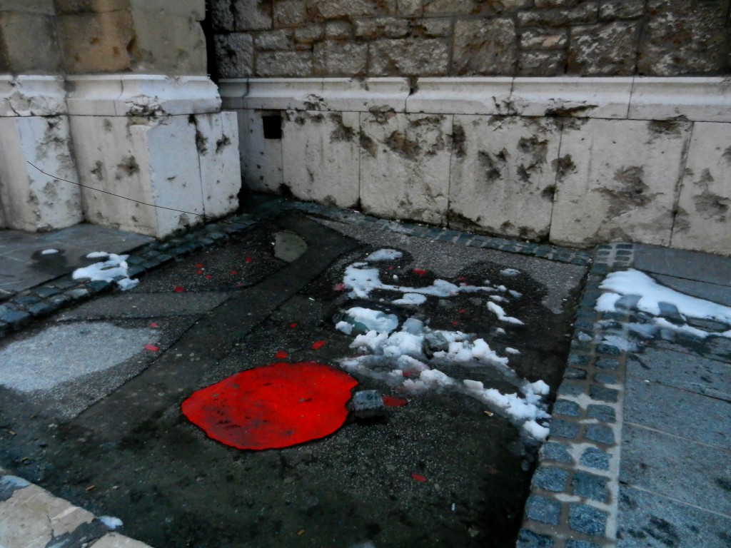 Our tour ended on a few last, sobering sights. Crossing the literal “line” marking where the more eastern and western influenced sides of the downtown meet, we soon found ourselves in front of the Sacred Heart Cathedral. Taking us around the side of the church we stood staring down on what looked like the result of someone dropping a bucket of red paint. This was one of Sarajevo’s roses, a scar in the pavement caused by a mortar shell that had been filled with red resin. These scars stood as memorials where a mortar shell had killed innocent civilians.