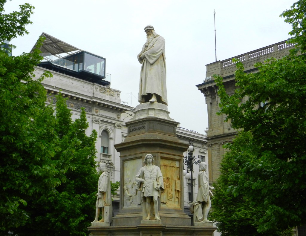 The extravagant Galleria Vittorio Emanuele II is one of the oldest shopping centres in the world (1861) and contains some of the most expensive brands in the world. Luxury, Italian retailers like Gucci, Prada, and Louis Vuitton flaunt their infamously pricey accessories, each with its own pedestal, from polished brass-framed windows. The arcade itself is extremely ornate with sculpture-adorned halls, mosaic floors, and a 47-metre high glass dome, all built in a Neo-Classical design. The Gallery’s cafes and restaurants make it a perfect meeting place, and it has been nicknamed Milan’s living room. We really enjoyed walking through this beautiful arcade, laughing at some of the ridiculous prices, but we eventually found ourselves coming out the other side into Piazza della Scala. We rested in the centre of Scala Square, under the severe gaze of Leonardo Da Vinci‘s statue, before continuing our tour.