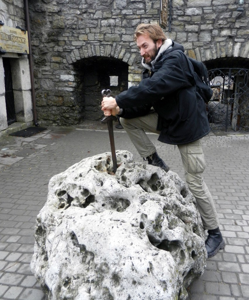 Within the Old Town, on our way up to the castle, we enjoyed gazing at a few beautiful churches, quirky art pieces (like the Tourist and a giant purple cat mural), and attempting to pull a magic sword from the stone to become the one true king and unite all of Ukraine (too soon?).